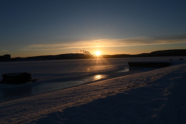 Det roliga med dessa 4 första bilder är att de naturligtvis är vackra. Här åkte jag skoter till min arbetsplats som ligger strax till vänster utanför bild, men mina förfäder växte upp i detta område på slutet av 1800 talet på farmors sida. Nu till ännu en iakttagelse, din headerbild om du tittar rakt in i kulan har du 2,9 km från min strand till där du stod på kajen och plåtade solens nedgång. Jo detta är mina far och hemmavatten (året om) Den rosa/lila bilden med SNÖ på träden är bara några minuter man han chans att fånga en sådan där lyckad dag. Träden med SNÖ från Örnen “tycker” jag inte om dess byggnader. Ni kapade ner min skog där jag lekte Cowboys & Indianer som liten och plockade blommor samt åkte pulka i den backen nedför, innan ni byggde upp detta område 😉 Sista bilden gillas skarpt men jag är offside på plats. Du får ha en fin lördag i detta fina -13 gradiga väder 🙂